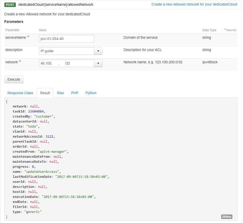 L'IP est ajouté est vérifiable avec l'appel suivant : /dedicatedCloud/{serviceName}/allowedNetwork/{networkAccessId} (le networkAccessId est visible dans l'appel précedent).