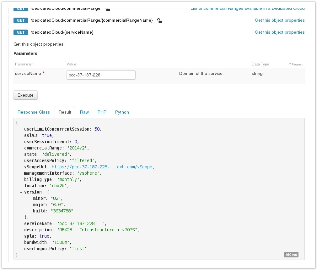 Exemple : cliquez sur la partie /dedicatedCloud/{serviceName} et renseignez votre Private Cloud dans le champ. Après avoir cliqué sur "Execute", le résultat sera similaire à :