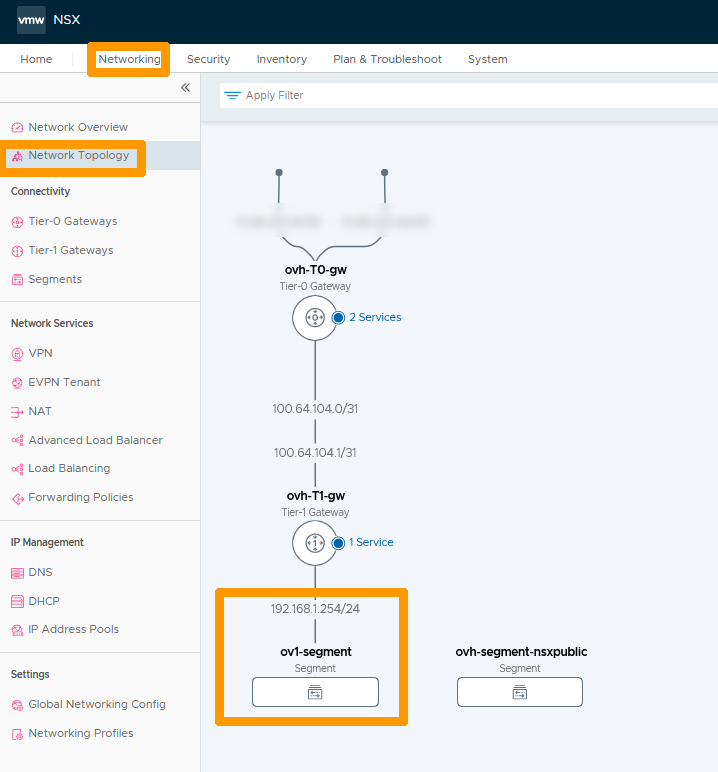 Go back to the NSX interface, go to the Networking tab and click on Network Topology on the left to view a graphical view of the network. You will see networks of type Overlay and those of type VLAN connected through an interface on ovh-t1-gw.