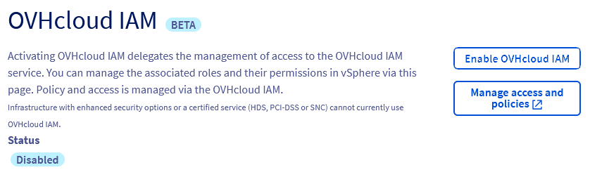 OVHcloud IAM is not available on environments with advanced security and certification options (PCI-DSS, HDS, HIPAA, SNC).