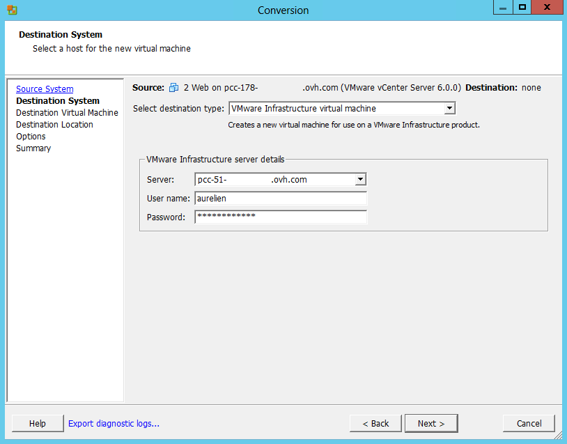 In the dropdown menu, select "VMware Infrastructure.." and enter the name of your source (in this case, our Private Cloud), as well as your user name and password.