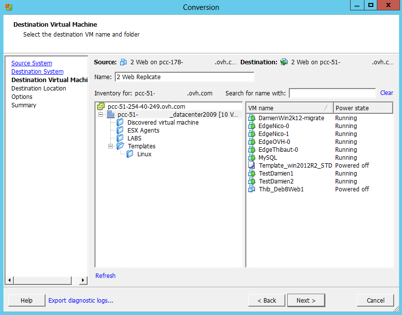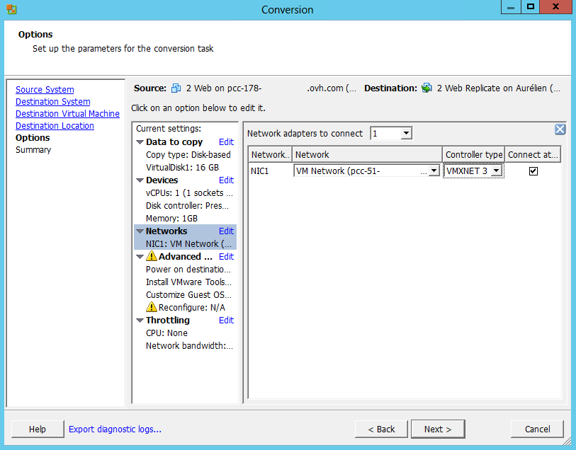 You can then modify the settings of the destination VM if necessary, for example if a network is different.