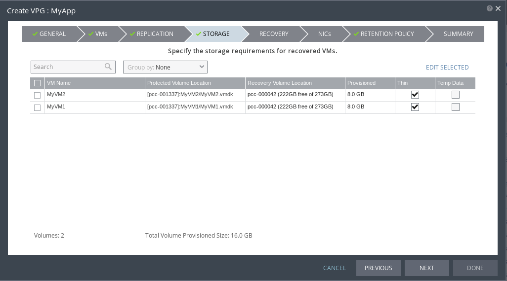 Before starting the replication, VMs must be grouped in a logical container called Virtual Protection Group, on which all replication parameters will be defined.