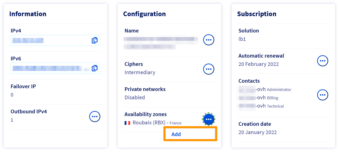 The OVHcloud Load Balancer is a critical component for distributing network traffic across your infrastructure. To ensure the highest level of service and optimal user experience, it is essential to deploy your Load Balancer across multiple availability zones (AZ). When subscribing to an OVHcloud Load Balancer service, you may choose one or more availability zones in which the service will be located. You also have the possibility to order additional zones for an existing service.