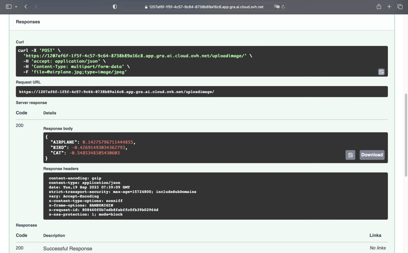 In our example, the URL is as follows: https://1207af6f-1f5f-4c57-9c64-8738b89a16c8.app.gra.ai.cloud.ovh.net/docs