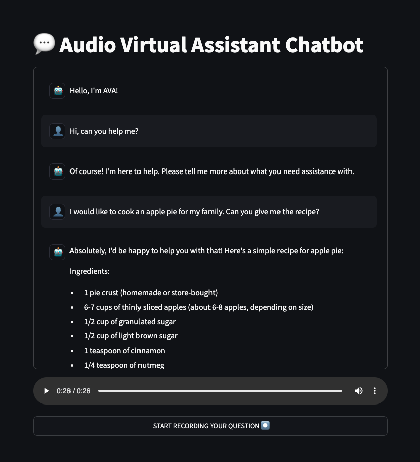 You've just created an Audio Virtual Assistant capable of natural conversation using voice, powered by ASR, LLM, and TTS endpoints.