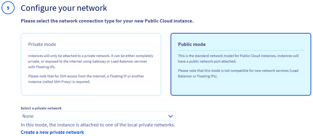 In this step you need to apply the Public Cloud network mode you have decided on, based on the information in Step 3 above. Your options depend on the previous choice of location for the instance (Region or Local Zone).