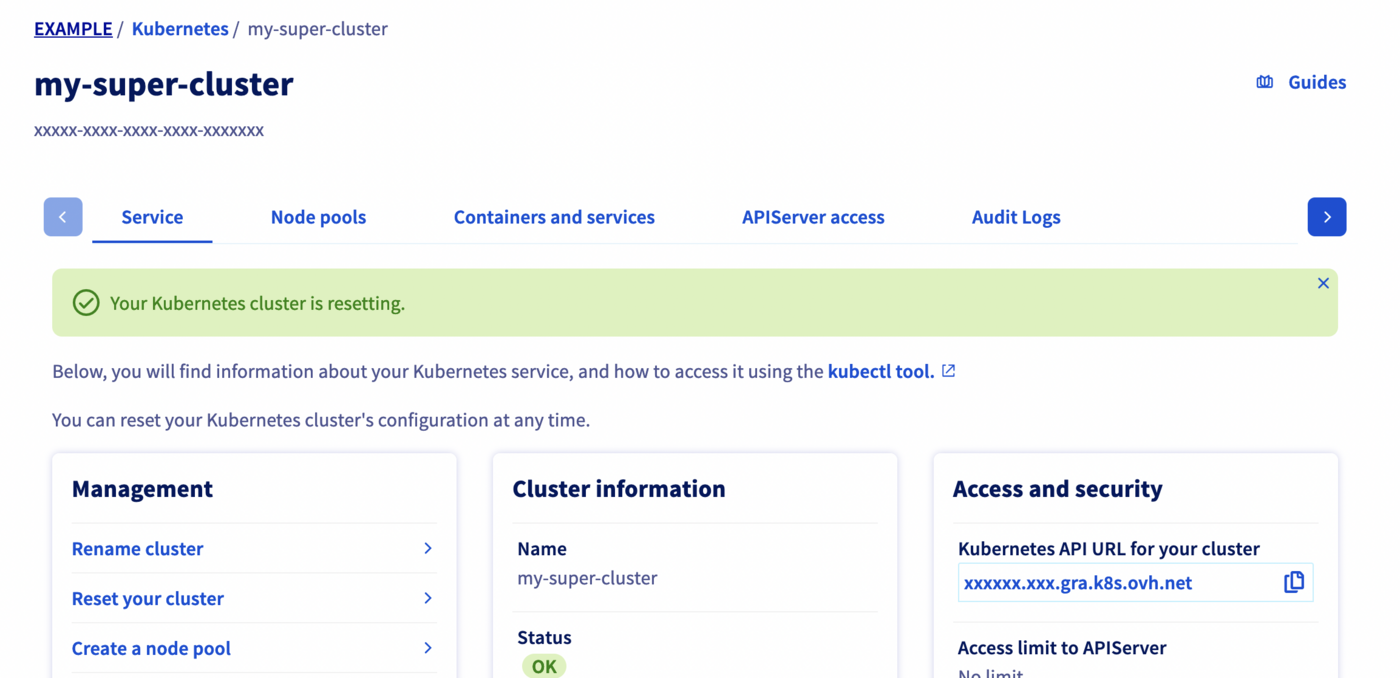 Through the OVHcloud Control Panel and the API, you can reset your OVHcloud Managed Kubernetes cluster.