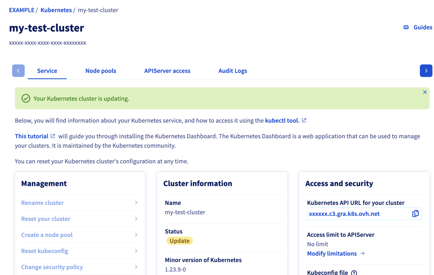 The upgrading process can take several minutes (around 5 minutes per node in your cluster). During that time, a message on the OVHcloud Control Panel warns you that the cluster is being upgraded: