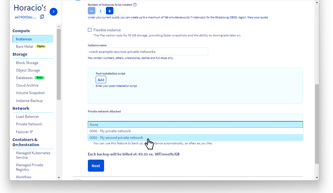 Now we can create a new Public Cloud instance inside the vRack, by following the Integrating an instance into vRack guide.