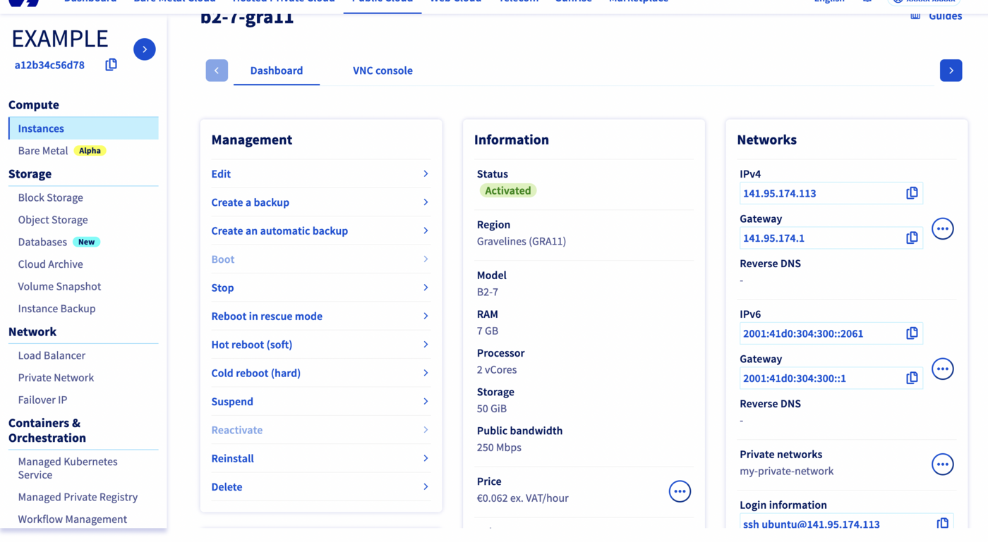 After instance creation, click on the name of the newly created instance, and then scroll down a little in order to see the connection details in the OVHcloud Control Panel.