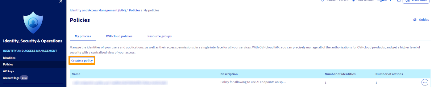 These roles are assigned through IAM policies. To create and configure a policy, log in to the OVHcloud Control Panel and navigate to the Identity, Security & Operations section. Then, in the left-hand menu under Identity and Access management, click on Policies and click the Create a policy button.