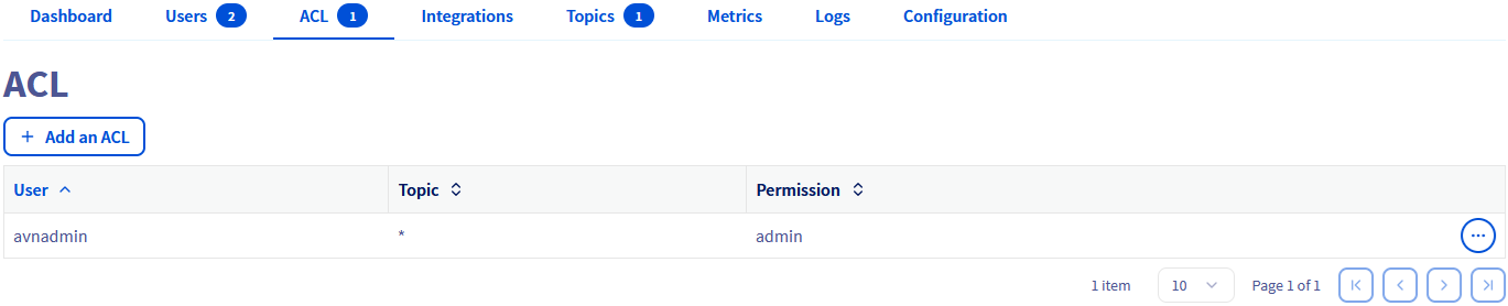 By default the admin user has access to all topics with admin privileges. You can define some additional ACLs for all users / topics, by clicking on the Add an ACL button from the ACL tab: