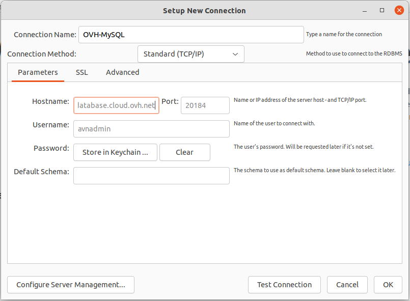 In the Setup New Connection dialog box, fill in the Parameters tab form with the previously collected information.