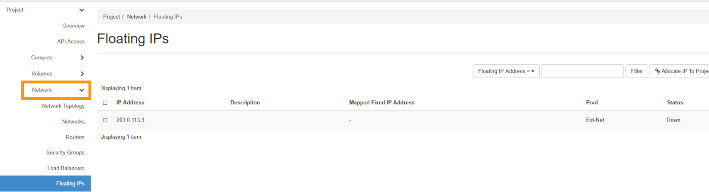 As you can see, the VM only has a private IP but it is available from the Internet via the Floating IP.