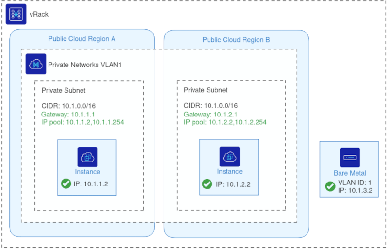 In this example, two Public Cloud instances in different regions and one Bare Metal server all share the same VLAN ID and have been assigned the same IP address.