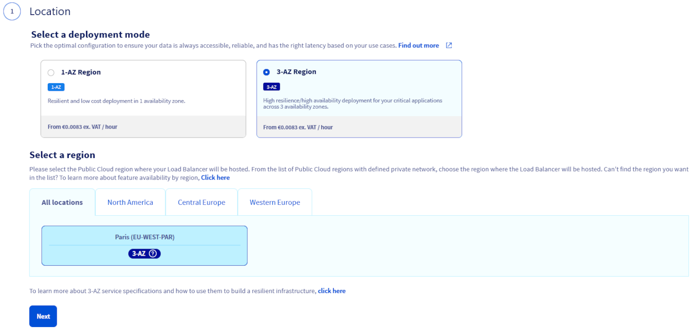 Choose the region: Only regions where you have a private network and at least one subnet can be selected. Select the region and click Next.