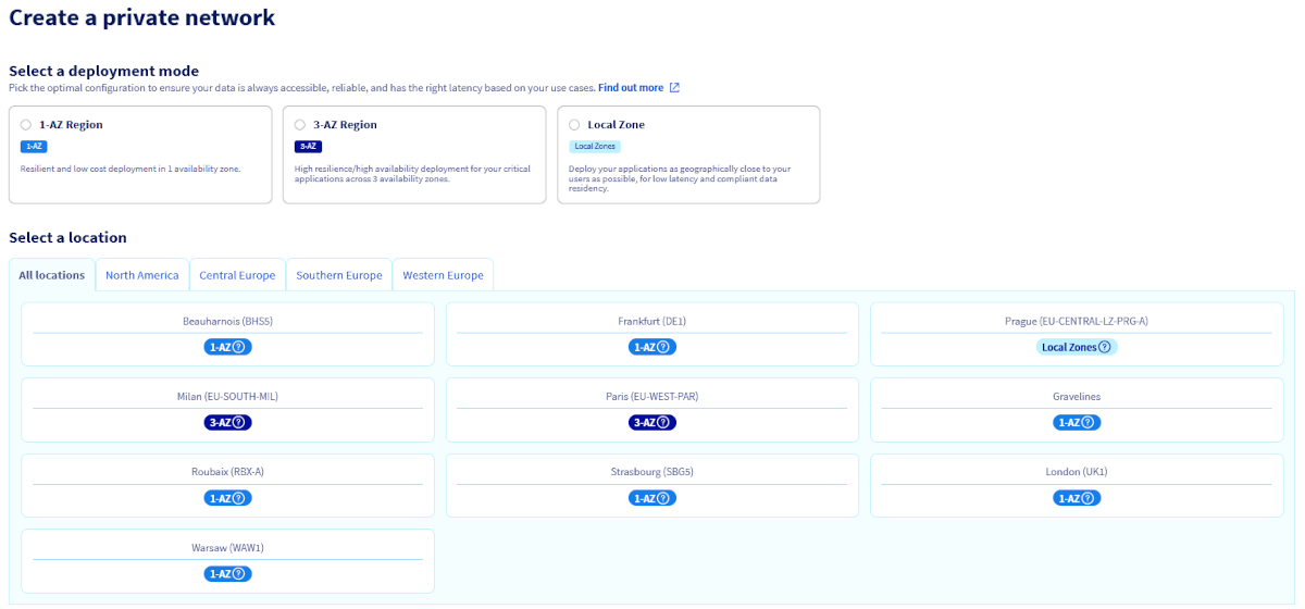 To begin, select a deployment mode and the region in which you want to create the private network.