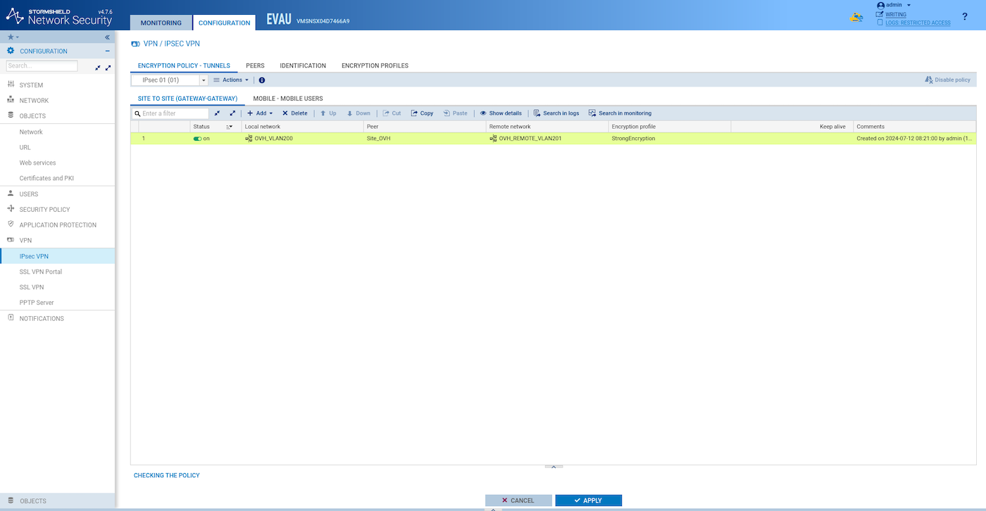 After deploying SNS Elastic Virtual Appliance firewall, it can be used in multiple advanced security scenarios such as IPsec VPN, SSL/TLS VPN, network gateways (IN or OUT) as described below. Thanks to the vRack private network, listed VLANs can also be used outside the Public Cloud environment: across Bare Metal or Private Cloud products.