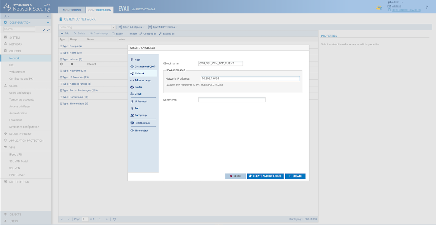 This guide provides step-by-step instructions for deploying and configuring SNS EVA on the OVHcloud Public Cloud with vRack and public IP routing, covering key features such as network firewalls, IPSec VPNs, and SSL/TLS VPNs. By following this guide, you will enhance the security of your OVHcloud Public Cloud infrastructure and ensure safe and secure operations.