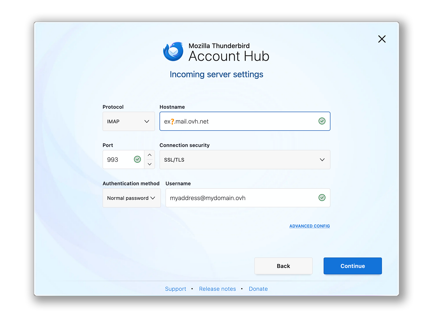 When Thunderbird detects an OVHcloud domain name, an automatic configuration related to the MX Plan offer is proposed. Click on MODIFY THE CONFIGURATION.