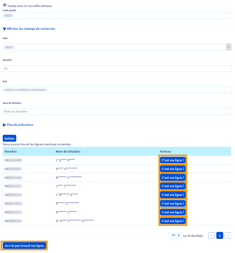 Dans le cas où une ou plusieurs lignes inactives existent à votre future adresse, un tableau s'affichera avec les numéros de lignes disponible à cette adresse.
