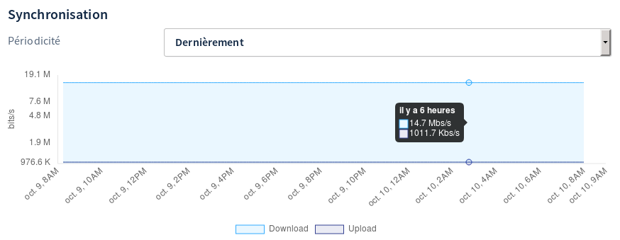 Prenez connaissance des informations qui s'affichent dans le graphique sur la période que vous souhaitez vérifier. Nous vous conseillons de noter ces informations. Par exemple, l'image ci-dessous montre un modem disposant actuellement d'un débit synchronisé stable de 14,7 Mbit/s en descendant et de 1,01 Mbit/s en montant.