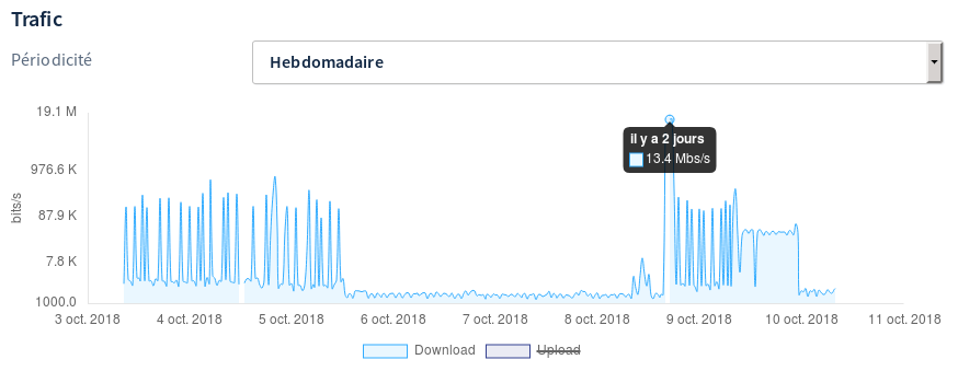 Vérifions à présent le trafic utilisé sur votre connexion. Toujours positionné sur l'onglet Mon accès, descendez dans la page jusqu'à voir la section Statistiques. Visualisez alors le graphique intitulé « Trafic ». Ce dernier représente l'utilisation du débit descendant (dit « download » pour les données reçues) et montant (dit « upload » pour les données envoyées) de votre connexion Internet.