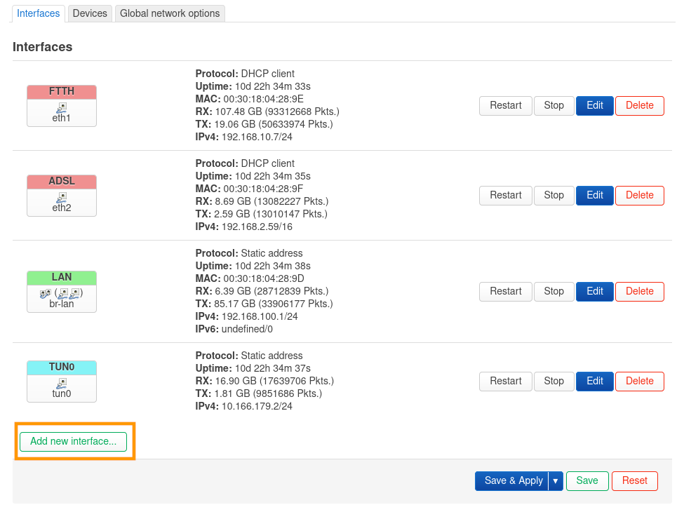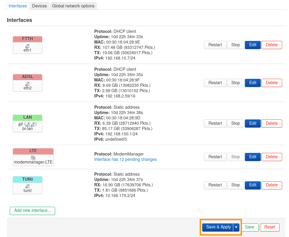 Supprimez l'interface que vous souhaitez ajouter au LAN avec le bouton Delete, dans notre exemple eth3_dhcp.