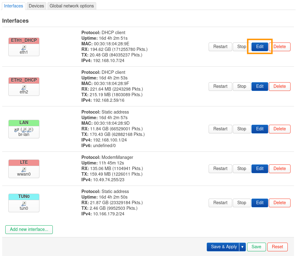 Sélectionnez l'interface à modifier, dans notre exemple eth1_dhcp.