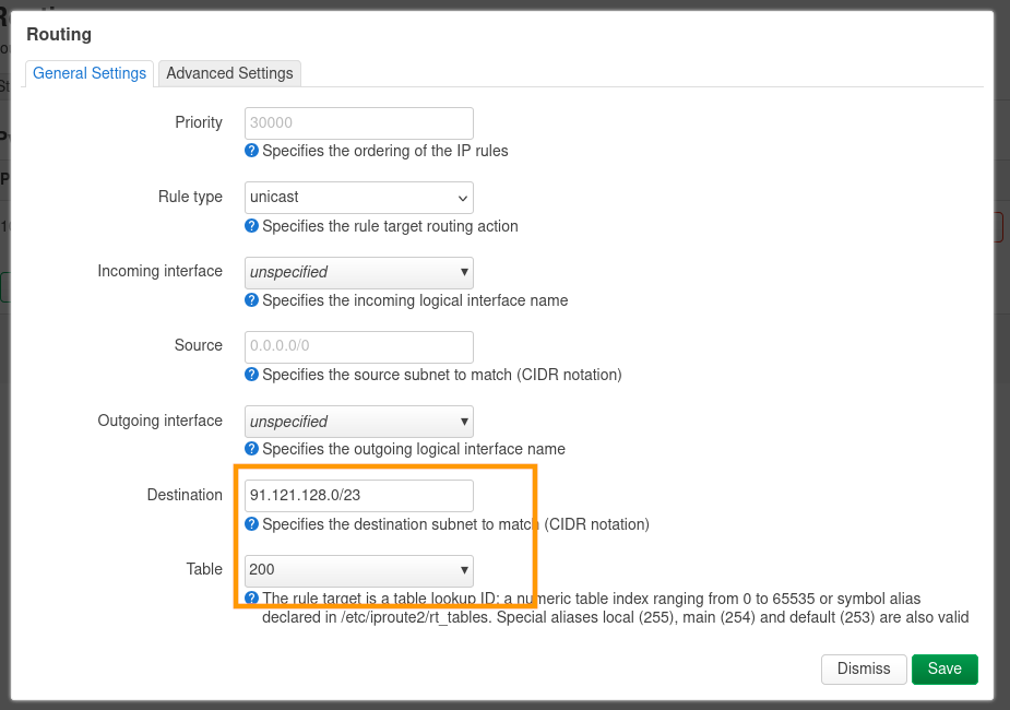 Pour le paramètre Table, configurez la table de routage qui correspond à l'interface. Pour notre exemple, comme vu à l'étape 3, l'interface eth1_dhcp utilise la table de routage 200.