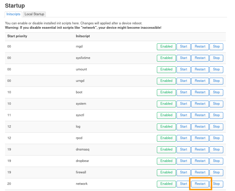 Choisissez l'InitScript network et cliquez sur le bouton Restart.