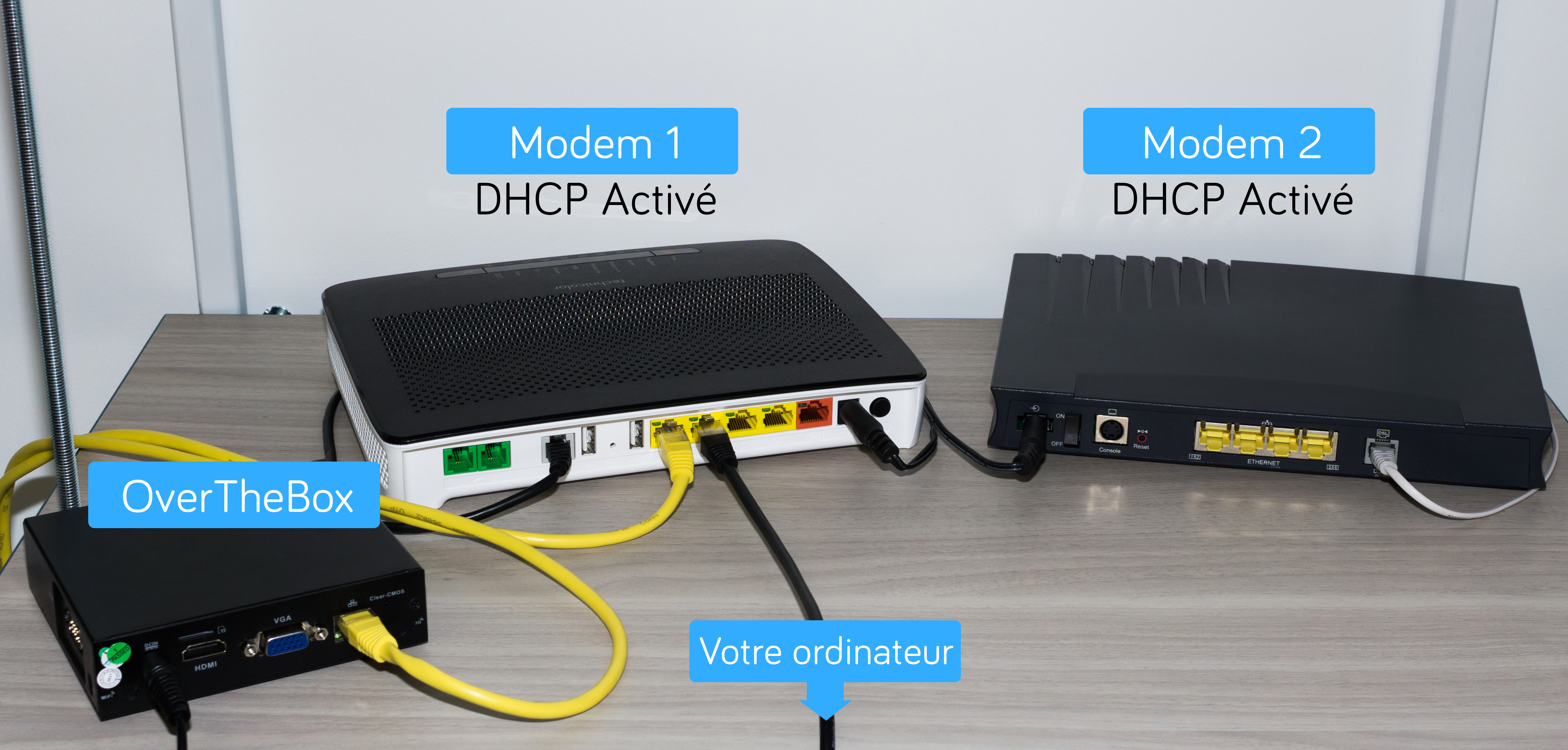 Les opérations qui suivent doivent être effectuées depuis un ordinateur connecté directement sur le modem principal afin que votre OverTheBox soit reconnue (câble noir sur l'image ci-dessous).