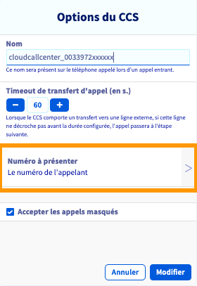 • présenter le numéro du CCS, c'est à dire le numéro alias qui a été composé par l'appelant, ce qui peut être utile si vous possédez plusieurs numéros alias configurés;