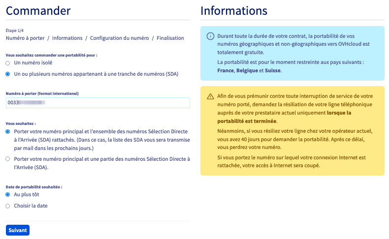 Tranche de numéros (SDA)Comme son nom l'indique, il s'agit d'une tranche de plusieurs numéros. Il est possible de porter tout ou partie des numéros de cette tranche. Un mandat de portabilité est alors nécessaire pour effectuer la demande. Celui-ci vous sera transmis par OVHcloud durant les étapes du processus de portabilité.