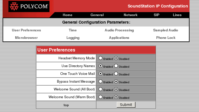 Si la page vous demande un nom d'utilisateur et un mot de passe il s'agit de Polycom et le mot de passe est 456.