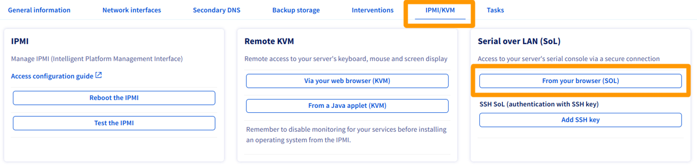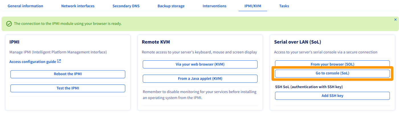 En la sección Serial over LAN (SoL) del área de cliente de OVHcloud, haga clic en Desde su navegador (SoL).
