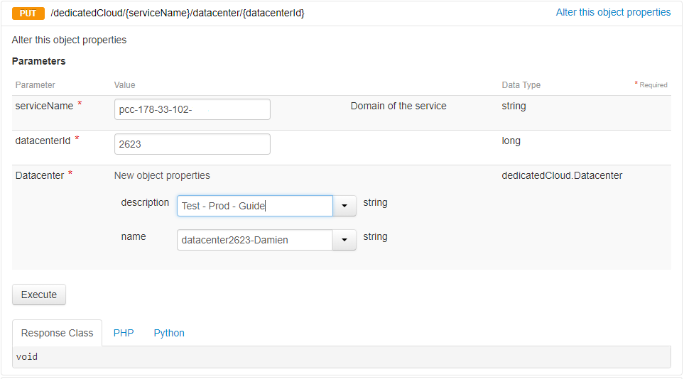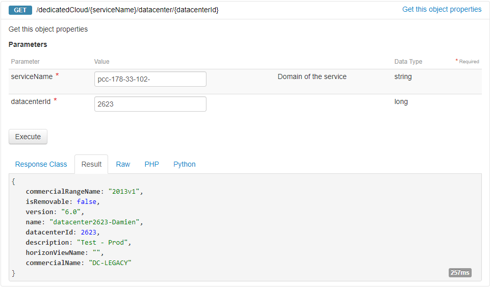 Exemple : Après avoir récupéré les informations sur mon datacentre avec l'appel suivant : /dedicatedCloud/{serviceName}/datacenter/{datacenterId}