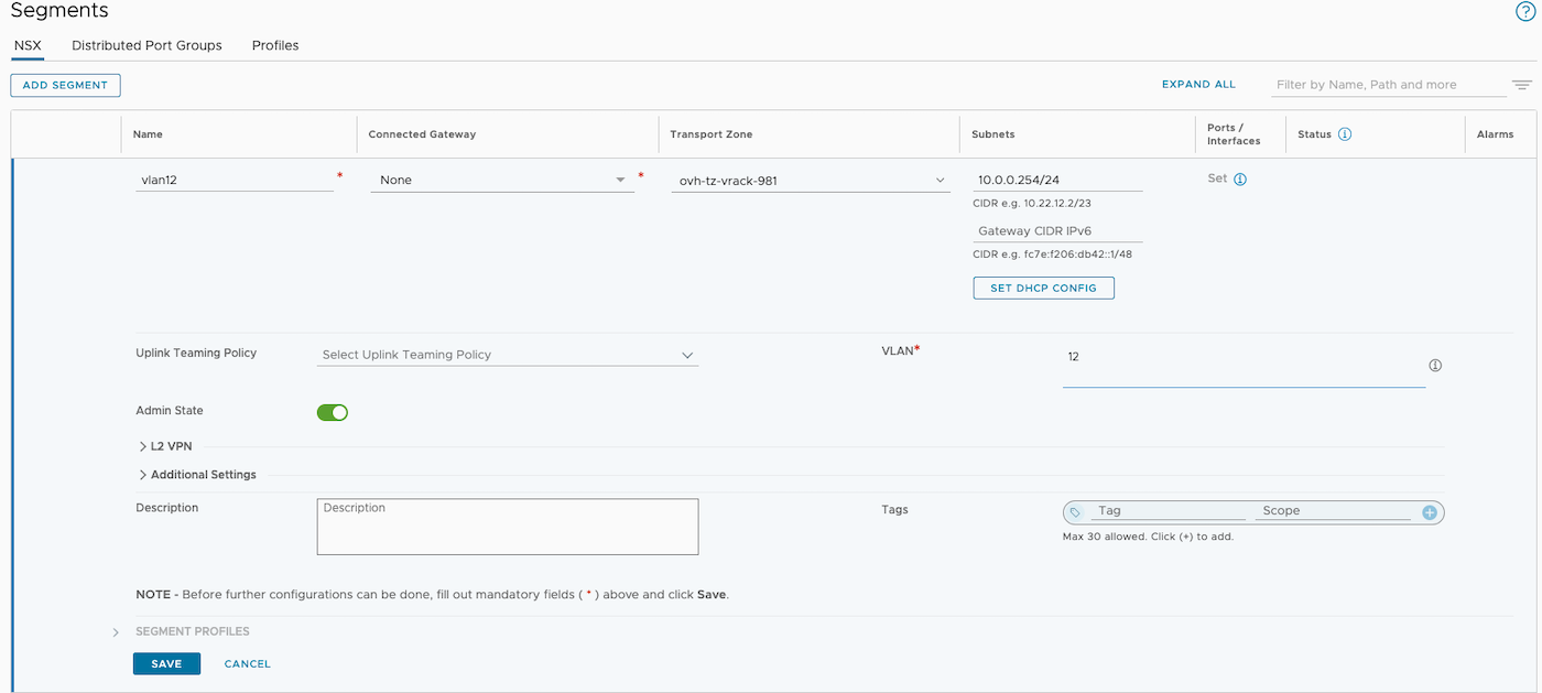 In the Segments > Add Segment section, create a segment in the transport region ovh-tz-vrack on VLAN 12. Assign any IP address to the gateway, as we do not intend to use it.