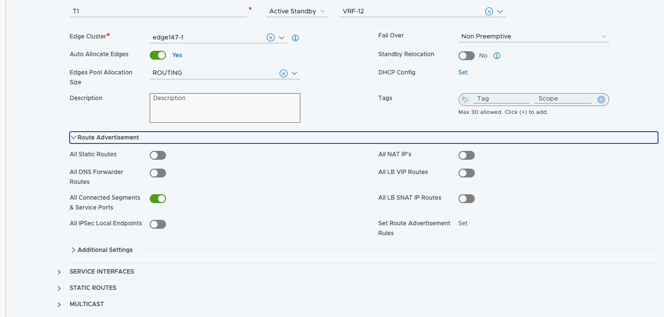 In the Tier-1 Gateways > Add Tier-1 Gateway section, create a new T1 gateway. Choose a name that suits your needs, then connect it to the VRF you have created and finally, connect it to your Edge cluster.