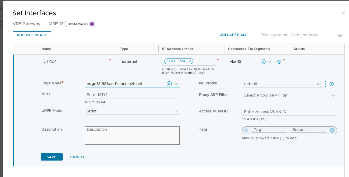3. Configure two interfaces, one for each edge. Choose two free addresses from your VLAN IP range (for example, we will take 10.0.0.1/.2/.3/.4), then connect them to the VLAN12 segment you have created.