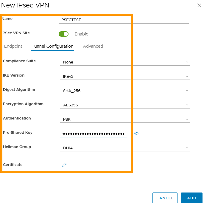 In the Tunnel Configuration page, set your encryption parameters (including certificates if needed) then click Add.
