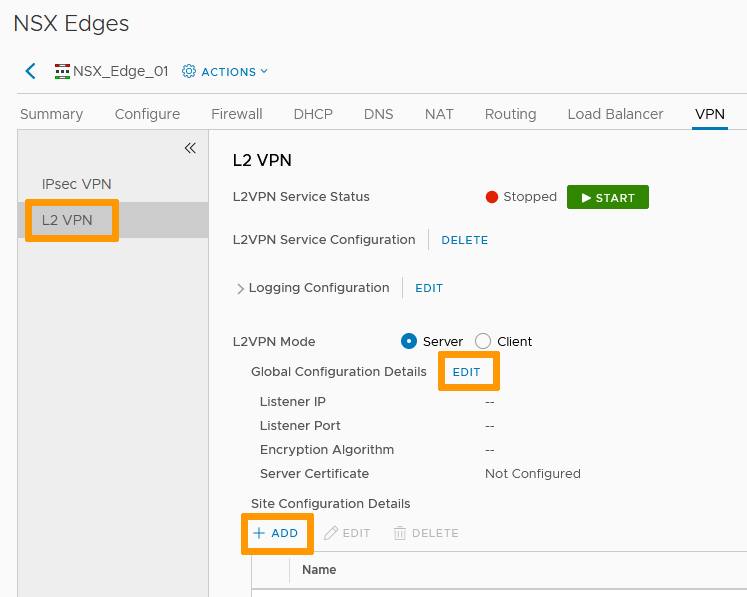 L2 VPN is a Client-Server type of connection. We will set up the Server first.