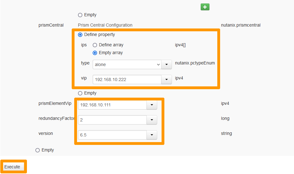 In the Prism Central Configuration section, check Define property and Empty array.