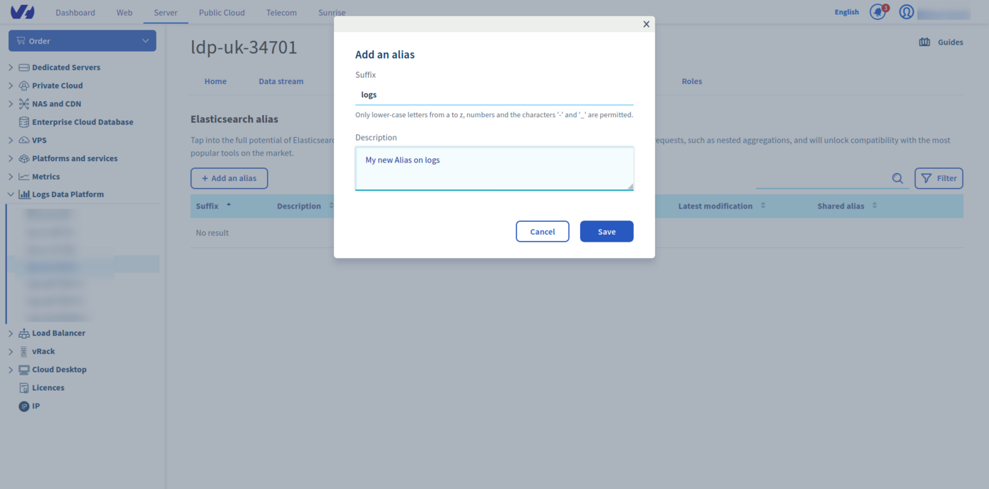Set https://<your_cluster>.logs.ovh.com:9200 as URL value