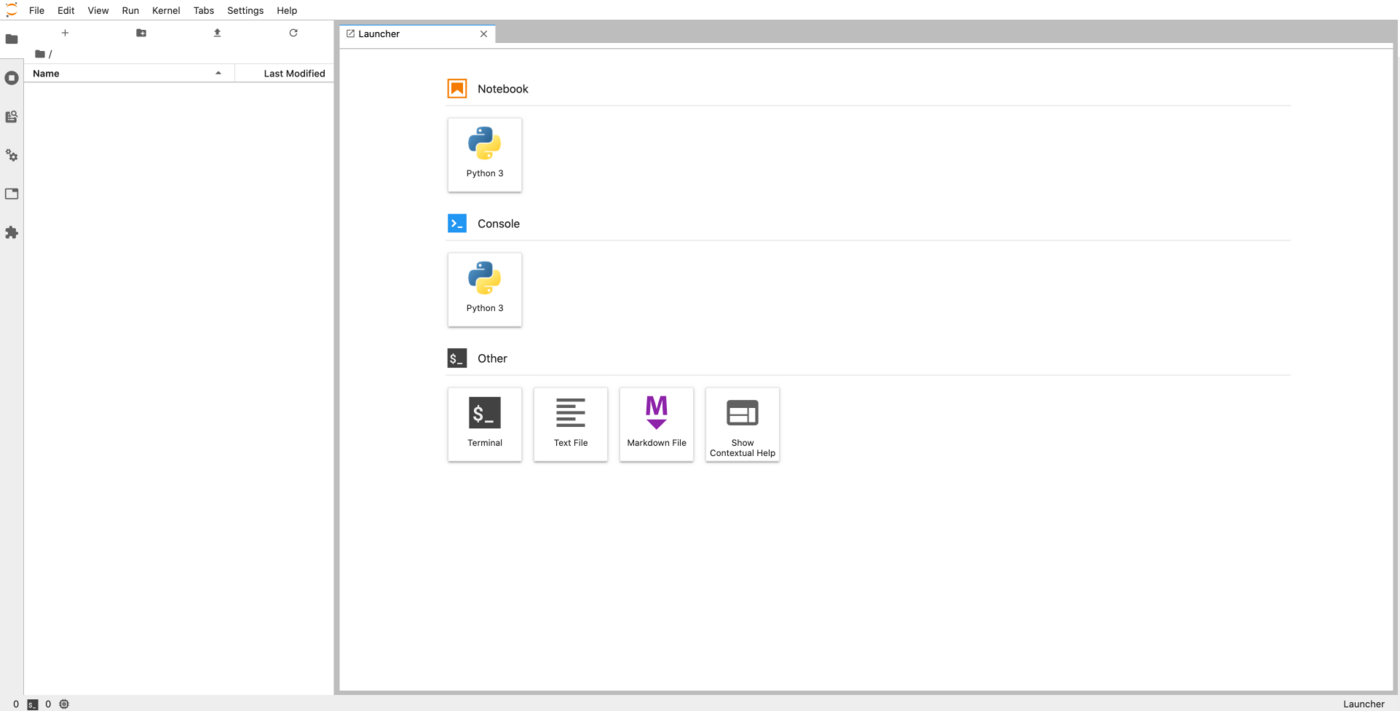 Now that the notebook is in the RUNNING state, a https address is defined in the Url field. This URL corresponds to your JupyterLab server. Pasting this URL in your browser displays the following screen: