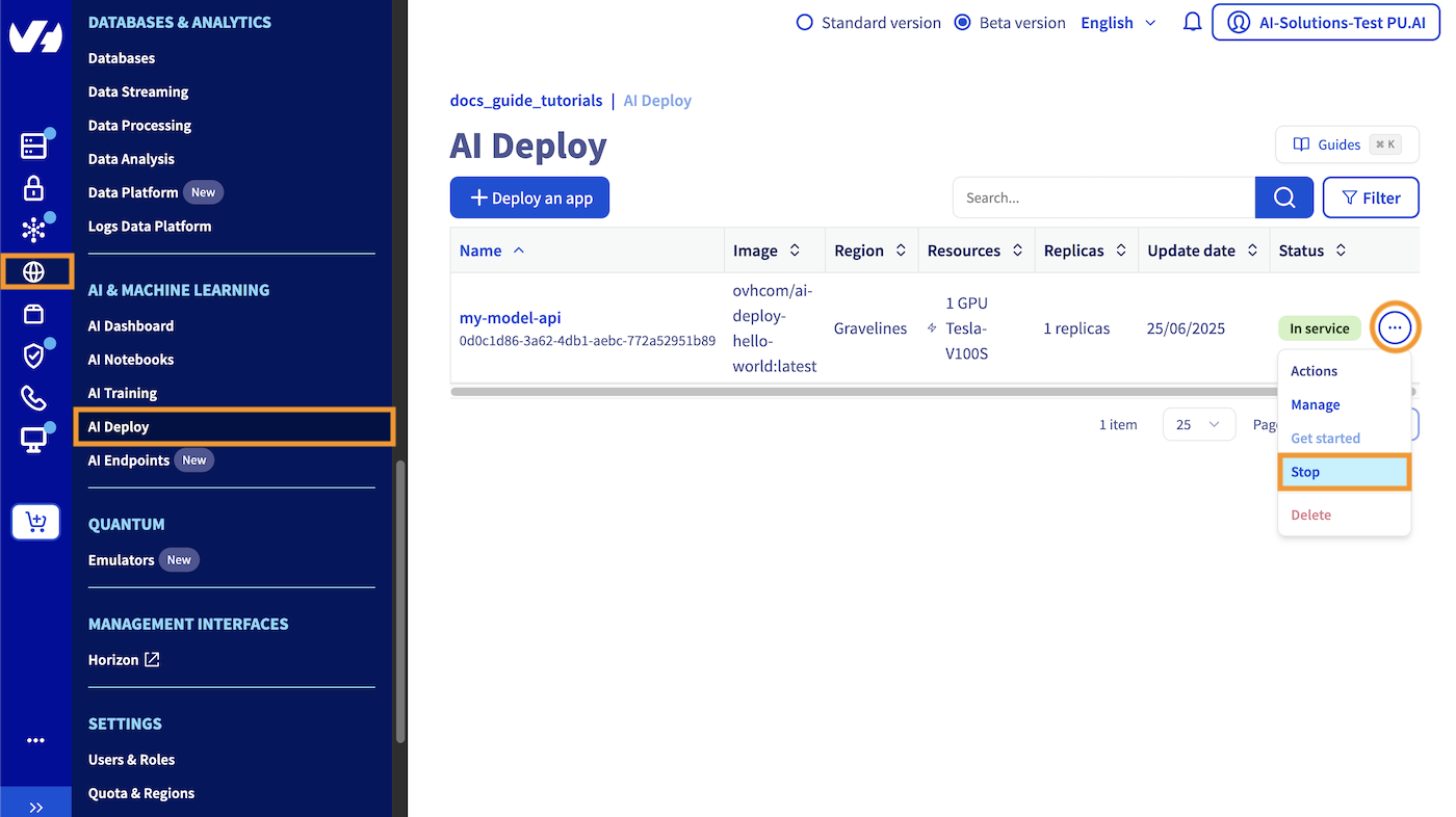 You have the flexibility to keep your AI Deploy app running for an indefinite period. At any time, you can easily stop your application, using either the UI (OVHcloud Control Panel) or the ovhai CLI.