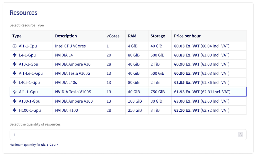To deploy an AI Deploy app, you must allocate compute resources. The app supports a range of resource configurations:
