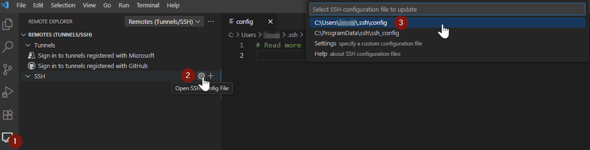 From there, click the gear icon on the SSH feature to access the SSH configuration file for VSCode, typically located at ~/.ssh/config, and open it.