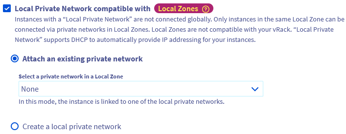 Además, puede conectar la instancia a una red privada (no compatible con el vRack) si selecciona la opción Red privada local compatible con Local Zones (consulte la pestaña Red privada local).
